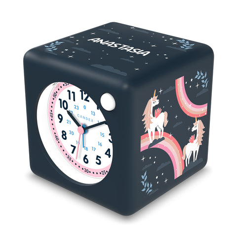 Dieser dunkelblaue Kinderwecker mit Einhornmotiven ist ein wunderschönes Accessoire für das Kinderzimmer und mit dem bunten Ziffernblatt wird das Lernen der Zeit zum Kinderspiel. Die niedlichen Einhornmotive auf dem Wecker werden kleine Kinderherzen höher schlagen lassen. Der Wecker hat eine Kantenlänge von 10 cm, ein beleuchtetes Ziffernblatt und eine Snooze- Funktion. Aufgrund des integrierten Sweep-Uhrwerks gleiten die Zeiger nahezu geräuschlos über das Zifferblatt und verursachen keine Tick-Geräusche. Bei Dunkelheit kann dieser Lernwecker mit einer Taste beleuchtet werden, wodurch die Uhrzeit problemlos abgelesen werden kann. Das Produkt benötigt keinen Stromanschluss. Das Uhrwerk und das LED-Licht werden mit drei 1,5 Volt AA Batterien betrieben, die nicht im Lieferumfang enthalten sind.