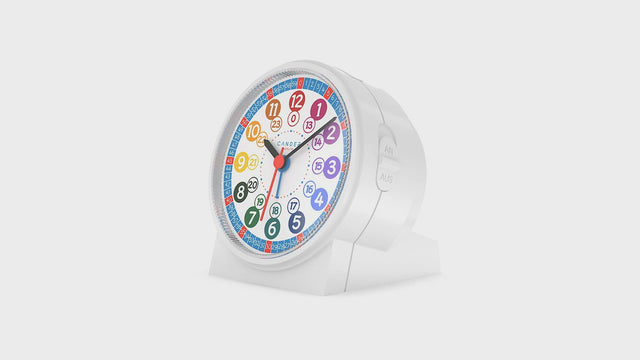 Bringen Sie Ihrem Kind mit dem Wecker MNU 1009 S von Cander Berlin spielerisch innerhalb weniger Minuten das Uhrenlesen bei, unabhängig vom Alter und von den Lernfähigkeiten. Die Tischuhr mit Weckfunktion ermöglicht das Ablesen der digitalen Uhrzeit mit einer analogen Uhr zu erlernen. Sie zeigt sowohl das 12-Stunden als auch das digitale 24-Stunden-Zeitformat an und eignet sich somit ideal zum Lesen lernen der Uhrzeit. Das strukturierte und zugleich farbenfrohe Zifferblatt ermöglicht das einfache Ablesen der Uhrzeit vom Bett und von der Ferne aus. Das weiße hochglänzende Plastikgehäuse in Kombination mit dem bunten Zifferblatt garantiert Ihnen eine schöne Optik. Der Wecker ist kindgerecht, verfügt über keine scharfen Kanten, ist standsicher und hat eine handliche Größe. Er hat einen Durchmesser von 10,8 cm und eine Tiefe von 7,5 cm. Die schwarzen Zeiger dienen zum Ablesen der Minuten- und Stunden, der rote Zeiger ist für die Sekundenangabe verantwortlich und der blaue Zeiger markiert die Weckzeit. Der Kinderwecker verfügt über ein geräuscharmes Sweep-Uhrwerk - es ist kein nerviges Ticken oder Summen zu hören. Nahezu lautlos schleicht der Zeiger vor sich hin und raubt Ihren Kindern weder den Schlaf noch die Nerven. Der Wecker zeichnet sich außerdem durch seine einfache Bedienbarkeit aus. Er verfügt über eine Taste auf der Oberseite, die für die Weckwiederholung (Schlummerfunktion, Snooze) und die Beleuchtung verantwortlich ist. Mit der Snooze-Funktion stoppen Sie den Alarmton für ungefähr 5 Minuten. Die Zifferblattbeleuchtung erlischt automatisch nach 5 Sekunden. Auf der rechten Seite befindet sich ein Schalter, der für das An- und Abschalten der Weckfunktion zuständig ist. Der Wecker benötigt keinen Stromanschluss, da er mit einem batteriebetriebenen Quarzuhrwerk ausgestattet ist. Das LED Licht und das Uhrwerk werden insgesamt mit drei 1,5 Volt AA Batterien betrieben, die sich nicht im Lieferumfang des Produktes befinden.