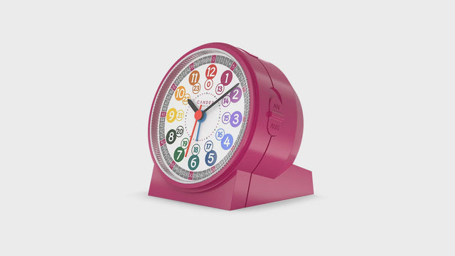 Mit diesem rosanen Wecker können Sie Ihrem Kind spielend leicht die Uhrzeit beibringen. Das farbige Zifferblatt und das 24-Stunden-Zeitformat erleichtern die Zuordnung der Stunden und Minuten. Die Tischuhr mit Weckfunktion ist von einem pinken Kunststoffrahmen mit hochglänzender Oberfläche umgeben und hat einen Durchmesser von 10,8 cm bei einer Tiefe von 7,5 cm. In dem Wecker ist ein nahezu geräuschloses Uhrwerk verbaut, welches keine Tick-Geräusche verursacht. Die 5 Sekunden Zifferblattbeleuchtung lässt sich durch Drücken des oberen Knopfes einschalten, wodurch nachts das Ablesen der Uhrzeit ermöglicht wird. Der Schalter, der für das An- und Abschalten des Weckers verantwortlich ist, befindet sich gut zugänglich an der rechten Gehäuseseite. Das Wecksignal beginnt erst leise zu erklingen und steigert im Anschluss die Lautstärke. Durch die integrierte Snooze-Funktion kann der Weckton für ungefähr 5 Minuten pausiert werden. Das LED Licht und das Uhrwerk werden insgesamt mit drei 1,5 Volt AA Batterien betrieben, die nicht im Lieferumfang des Produktes vorzufinden sind. Aufgrund des farbenfrohen Designs macht das Lernen der Uhrzeit noch mehr Spaß!