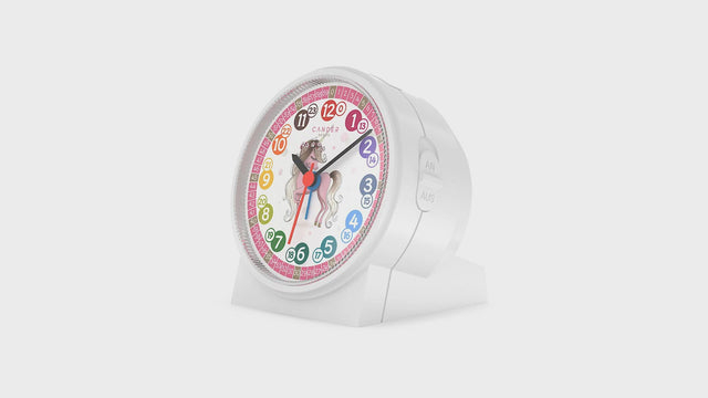 Verschönern Sie das Kinderzimmer mit diesem farbenfrohen Einhorn-Wecker! Die harmonisch abgestimmten Farben, zusammen mit dem liebevoll gestalteten Zifferblatt, machen ihn zu einem absoluten Blickfang im Kinderzimmer. Die Tischuhr mit Weckfunktion ist von einem weißen Kunststoffrahmen mit hochglänzender Oberfläche umgeben und hat einen Durchmesser von 10,8 cm bei einer Tiefe von 7,5 cm. Das integrierte Uhrwerk mit schleichender Sekunde verursacht keine Tickgeräusche und arbeitet nahezu geräuschlos. Der standsichere Mädchenwecker ist kindgerecht gestaltet, ohne scharfe Kanten und ist mit nur einem Einstellknopf ganz einfach zu bedienen. Praktisch sind auch die Licht- und die Snoozefunktion. Durch die integrierte Snooze-Funktion kann der Weckton für ungefähr 5 Minuten pausiert werden. Bei Dunkelheit kann dieser Lernwecker mit der Taste oben am Gehäuse für 5 Sekunden beleuchtet werden, wodurch die Uhrzeit problemlos abgelesen werden kann. Das LED Licht und das Uhrwerk werden insgesamt mit drei 1,5 Volt AA Batterien betrieben, die nicht im Lieferumfang des Produktes vorzufinden sind. Das süße Einhorn begeistert alle Kinderherzen und animiert Ihr Kind dazu, die Uhrzeit lesen zu lernen.