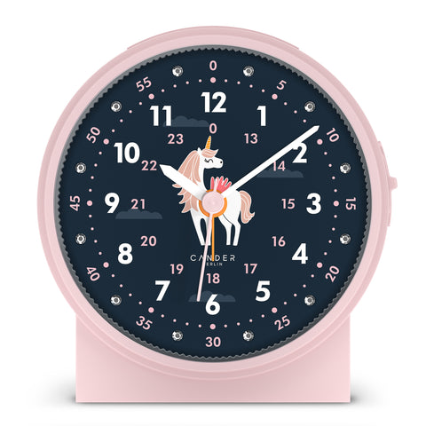 This blue alarm clock inspires the hearts of all children. The modern designed face of this children's clock is embedded in a high-gloss plastic frame and gives every child's room maximum coolness. The colorful children's alarm clock has a diameter of 10.8 cm and a depth of 7.5 cm. Due to the integrated sweep movement, the hands glide almost silently across the dial and do not make any ticking noises. When it's dark, this learning alarm clock can be illuminated with a button, which means that the time can be read easily. The product does not require a power connection. The movement and the LED light are powered by three 1.5 volt AA batteries, which are not included.