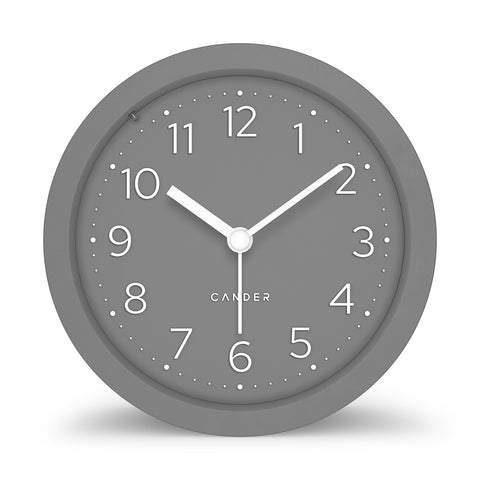 This elegant table clock made of gray MDF impresses with its simple elegance and embellishes every room. The analog table clock can be perfectly placed on any desk, bedside table and office shelf. The metal hands bring a lot of style to the room. The alarm clock has a diameter of 12 cm and a depth of 3.5 cm. The battery-powered movement is almost silent and does not cause any annoying ticking noises. A 1.5 volt AA battery, which is not included in the scope of delivery, is required to operate the table clock.