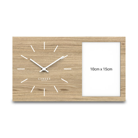 Unsere elegante rechteckige Wanduhr aus Eichenholz vereint zeitlose Ästhetik mit praktischer Funktionalität. Hergestellt aus hochwertigem Holzfurnier, besticht diese Wanduhr durch ihre natürliche Schönheit und ihr minimalistisches Design. Das Zifferblatt der Uhr ist in strahlendem Weiß gehalten und verfügt über klare, deutlich lesbare Ziffern. Die subtilen weißen Zeiger sorgen für eine übersichtliche Zeitangabe. Was diese Wanduhr jedoch einzigartig macht, ist die Möglichkeit, ein Bild in den Rahmen einzurahmen. In einer perfekt proportionierten Aussparung können Sie ein Foto, eine Zeichnung oder ein Kunstwerk Ihrer Wahl präsentieren und damit Ihrer Wanduhr eine ganz persönliche Note verleihen. Dieses innovative Merkmal ermöglicht es Ihnen, Ihre Lieblingsmomente immer wieder vor Augen zu haben, während Sie die Zeit im Blick behalten. Die Zeiger werden von einem nahezu lautlosen Mechanismus angetrieben, weshalb sie sich für alle Räume im Haus eignet. Die benötigte AA-Batterie ist nicht im Lieferumfang enthalten.