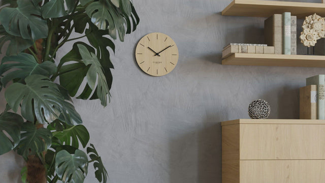 A wall clock doesn't just have to be functional, it can also set a stylish accent. The clock face is made of real wood veneer (oak), the natural grain of which makes each piece unique. The clock measures 30 cm in diameter and is 4 cm thick. The hands are powered by a nearly silent mechanism, making it suitable for any room in the house. The required AA battery is not included.