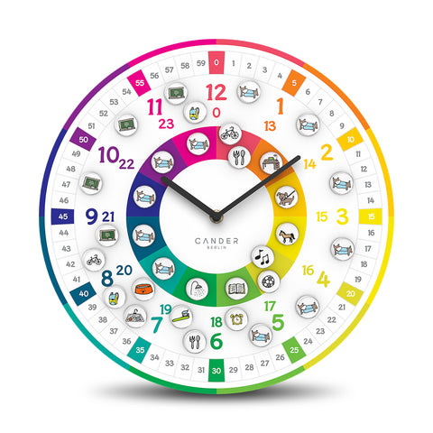 Diese liebevoll gestaltete Wanduhr überrascht mit vielen kleinen Details und bietet sich an, um deinem Kind auf spielerische Art und Weise an die Uhrzeit heranzuführen. Die Plättchen können auf alle Kinder zugeschnitten werden und die Interessen sowie Vorlieben deines Kindes im vollen Umfang widerspiegeln. Das Erlernen der Uhrzeit macht mehr Spaß, wenn beliebige Fotos oder Bilder verwendet werden, über die das Kind frei entscheiden kann. Technisch funktioniert dies über das Einbringen der eigenen Motive in die Döschen, die aus einem Klarsicht-Plastikgehäuse bestehen, aufschraubbar sind und den Austausch der Motive ermöglichen. Die Döschen sind auf der Unterseite mit einem Magneten versehen, sodass sie flexibel auf der magnetischen Oberfläche der Uhr haften. Das spielerische Entwerfen und Austauschen der eigenen Plättchen stellen einen persönlichen Bezug zu der Uhr her. Damit wird das Interesse des Kindes gesteigert, da der Uhr fortlaufend ein neues Erscheinungsbild verliehen wird. Der Lieferumfang beinhaltet 100 Tätigkeitsbilder und 40 magnetische Dosen um direkt loslegen zu können. Die Uhr hat einen Durchmesser von 30 cm und ist für Jungen sowie Mädchen geeignet. Durch die schleichenden Zeiger gibt die Uhr kein Ticken von sich und raubt deinem Kind weder den Schlaf noch die Nerven. Aus diesem Grund darf die Uhr in keinem Kinderzimmer oder Spielzimmer fehlen. Zum Betrieb der Uhr wird eine 1,5 Volt AA-Batterie benötigt, die nicht zum Lieferumfang des Produktes gehört. Das Produkt ist durch die Eintragung beim Deutschen Patent- und Markenamt gebrauchsmustergeschützt.