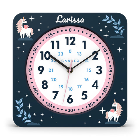 Diese dunkelblaue Kinderwanduhr mit Einhornmotiven ist ein wunderschönes Accessoire für das Kinderzimmer und mit dem bunten Ziffernblatt wird das Lernen der Zeit zum Kinderspiel. Die niedlichen Einhornmotive auf der Uhr werden kleine Kinderherzen höher schlagen lassen. Die Lernuhr, hat einen Durchmesser von 25 cm und ist eine tolle und nützliche Dekoration für das Kinder-, Spiel- oder Schlafzimmer eines jeden Entdeckers. Das integrierte schleichende Sweep-Uhrwerk ist lautlos und verursacht kein Ticken.