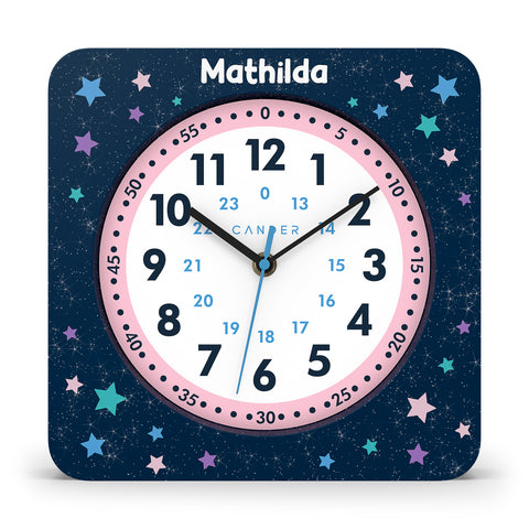 Diese dunkelblaue Kinderwanduhr mit mit Glitzereffekt und bunten Sternchen ist ein wunderschönes Accessoire für das Kinderzimmer und mit dem bunten Ziffernblatt wird das Lernen der Zeit zum Kinderspiel. Die Lernuhr, hat einen Durchmesser von 25 cm und ist eine tolle und nützliche Dekoration für das Kinder-, Spiel- oder Schlafzimmer eines jeden Entdeckers. Das integrierte schleichende Sweep-Uhrwerk ist lautlos und verursacht kein Ticken.
