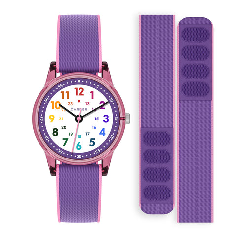 Diese violette Kinderarmbanduhr ist nicht nur eine tolle Ergänzung für jedes Outfit, sondern auch eine praktische Hilfe beim Lernen der Zeit. Das transparente Kunststoffgehäuse ist robust und widerstandsfähig, aber dennoch leicht genug für kindliche Handgelenke. Das weiche Klettarmband lässt sich einfach und schnell anpassen und sorgt für einen sicheren Halt der Uhr am Handgelenk. Das farbenfrohe Lernziffernblatt mit übersichtlicher und leicht verständlicher Farbkodierung erleichtert es Kindern, die Uhrzeit zu lesen und zu verstehen.