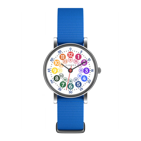 The watch is powered by a high-quality Japanese Seiko movement and ensures reliable timekeeping. It features a woven fabric strap and a metal case with a polished stainless steel base. The children's watch is splash-proof (1 ATM). Due to the well-structured dial, the watch enables you to learn how to read the digital time with an analog watch. It displays both 12-hour and 24-hour digital time format. The colorful design makes learning even more fun.