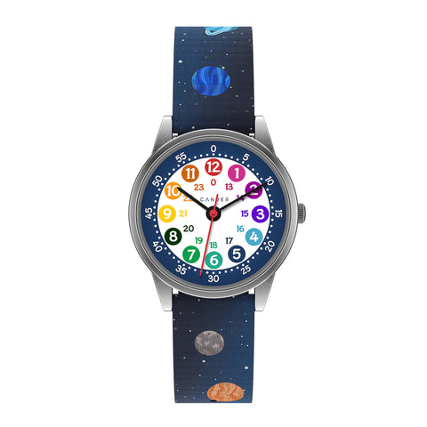 - Farbenfrohe analoge Lernuhr mit Weltraum-Motiv