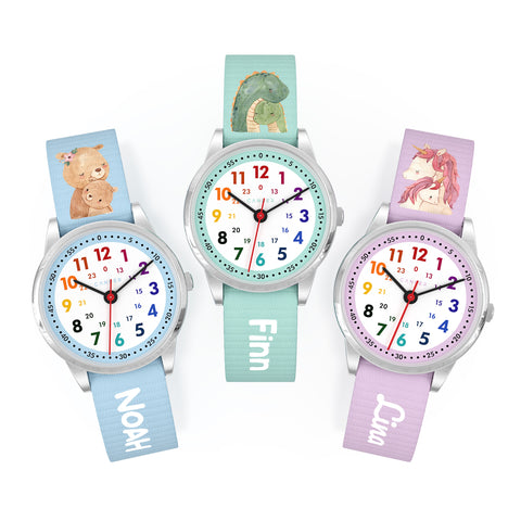 Die harmonisch abgestimmten Farben des Zifferblattes mit dem liebevoll gestalteten Armband in unterschiedlichen Farben begeistern die Herzen aller Kinder. Das atmungsaktive Stoffarmband wird mit deinem Wunschmuster und deinem Wunschnamen in Handarbeit für dich bedruckt. Die Armbanduhr eignet sich perfekt zum Lernen, da diese über ein 12- und 24-Stunden-Zeitformat verfügt. Bei einem Wasserschutz von 3 Bar können Wasserspritzer dieser Uhr