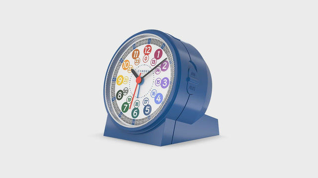 The colorful learning alarm clock MNU 1009 J makes getting up in the early morning much easier. This children's watch is perfect for learning the time as it displays both 12-hour and 24-hour digital time formats. Thanks to the diameter of 10.8 cm and a depth of 7.5 cm, the dial is very clearly laid out and easy to read. The integrated clockwork works pleasantly quietly and, thanks to the creeping second hand, does not make any ticking noises. In the dark, this learning alarm clock can be illuminated with the button on the top of the housing and the time can be read. Since this button is also responsible for the snooze function, the alarm can be paused for about 5 minutes. The alarm function can be switched on and off with a slider on the side of the housing. The product does not require a power connection. The dial illumination and the movement are powered by a total of three 1.5 volt AA batteries, which are not included.