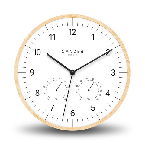 Solid wood and a simple dial also beautify your four walls. This wall clock combines modern design with elegant minimalism. The elegant dial is stylishly embedded in a high-quality frame made of solid beech wood. The clock measures 30.5 cm in diameter with a depth of 4.5 cm. It is ideal for your home, office, waiting room and entrance or reception area. The integrated clockwork works almost silently, does not cause any annoying ticking noises and works very precisely. A timeless wall clock made of wood that harmonises with all furnishing styles and gives the room maximum warmth and a feel-good atmosphere! Please note that wood is a natural product and growth, colour, structure and grain are unique to each tree. Deviations from the product photos are natural and do not constitute a reason for complaint.