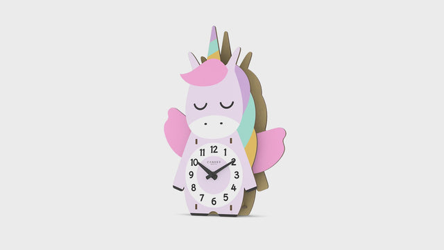 The extraordinary and at the same time modern wall clock MNU 9130 will enchant every viewer with its simplicity and beauty. The clear, lovingly designed dial with unicorn motif makes it easier for children to read the time. It has a height of 35 cm, a width of 25.5 cm and a depth of 4 cm. The flapping wings make the unicorn appear alive, making the clock a great focal point for any child's room. A suspension is integrated on the back of the clock, which allows the product to be attached to the wall. Alternatively, the product can be used as a grandfather clock and placed on the table. The product has a noiseless clockwork without ticking, which works almost silently. The clock is powered by two 1.5 volt AA batteries, which are not included.