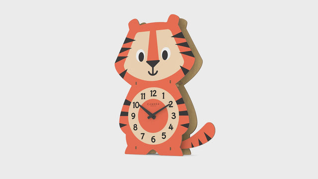 Die außergewöhnliche und zugleich moderne Wanduhr verzaubert jeden Betrachter mit ihrer Einfachheit und Schönheit. Das übersichtliche, liebevoll gestaltete Zifferblatt mit Tiger-Motiv ist für Jungen sowie Mädchen geeignet und erleichtert Kindern die Uhrzeit abzulesen. Die nachhaltige Kinderuhr aus Holz verfügt über ein spezielles 3D-Design und ist ein stilvoller Blickfang für jedes Kinderzimmer. Der auf und ab wippende Schwanz lässt den Tiger lebendig erscheinen, wodurch sich Ihr Kind ewig an diese Uhr erinnern wird. Die Pendeluhr hat eine Höhe von 39 cm, eine Breite von 27 cm und eine Tiefe von 4 cm. Das integrierte Uhrwerk arbeitet nahezu lautlos und verursacht keine störenden Tick-Geräusche. Zum Betrieb der Pendeluhr werden zwei 1,5 Volt AA Batterien benötigt, die sich nicht Lieferumfang des Produktes befinden.